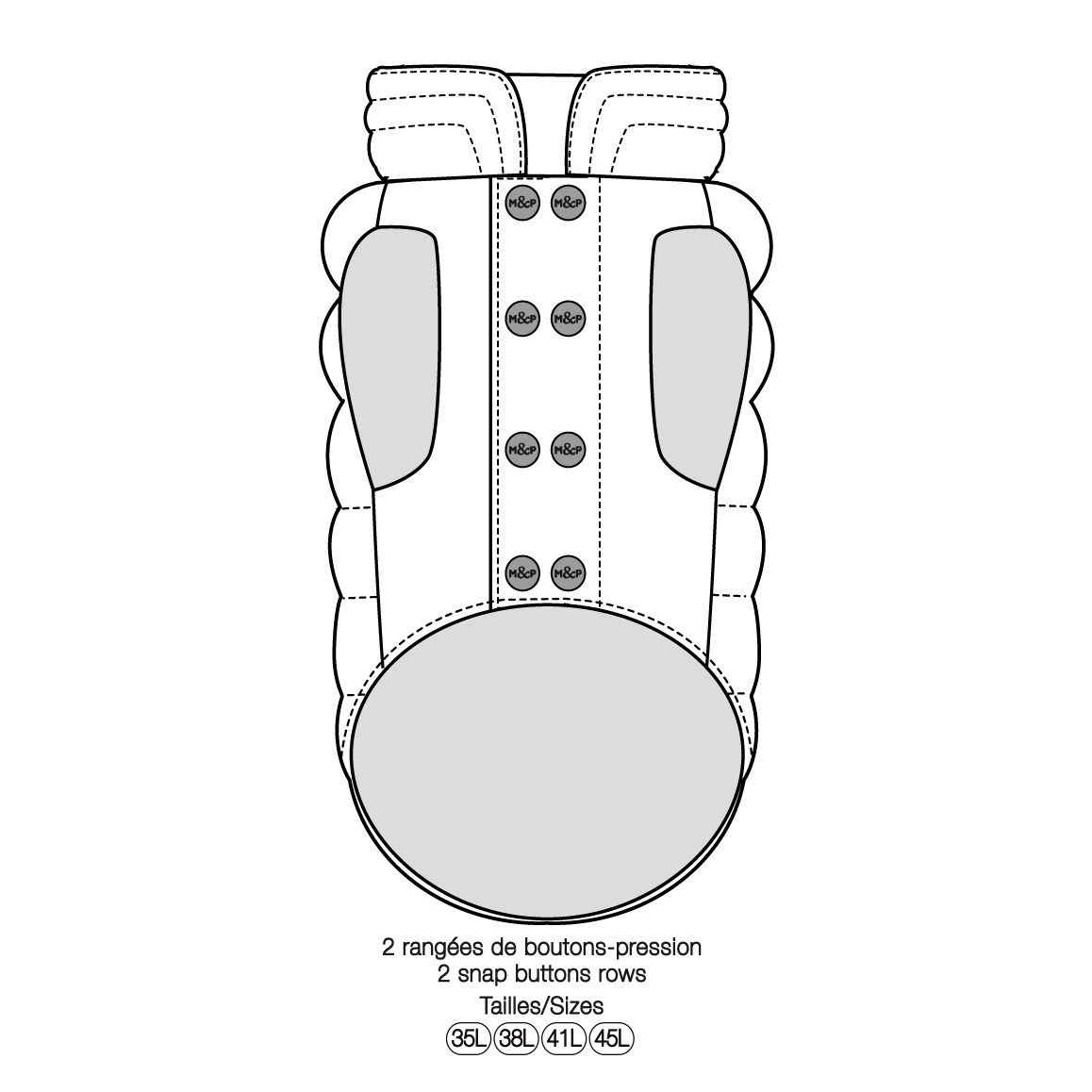 • Zapína sa pod bruchom na kovové cvočky v titánovej farbe s vyrytým "M&P"